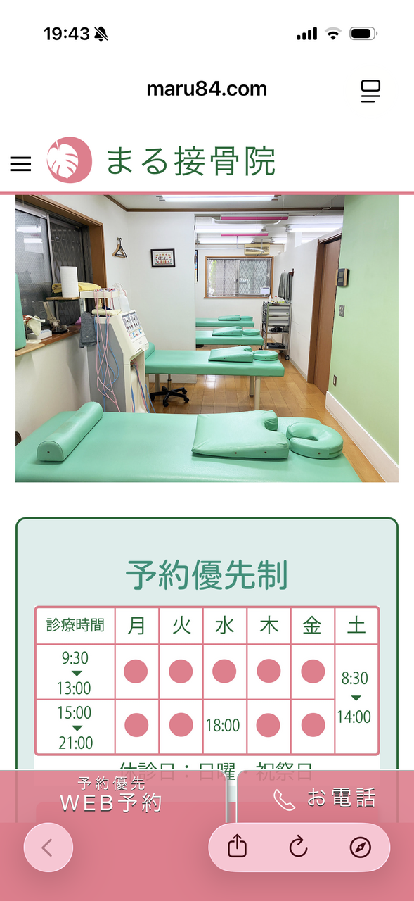 お待たせしないようにと、まる接骨院さんでは予約システムが導入されています。ウェブサイトのリンクからご予約が可能です。